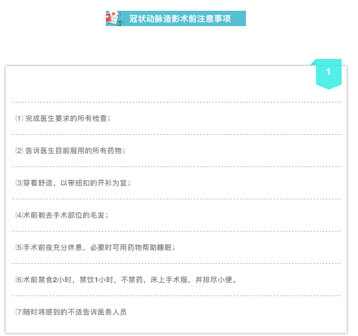 而冠狀動(dòng)脈造影作為一種有創(chuàng)檢查,無論是術(shù)前還是術(shù)后,都有很多需要患者關(guān)注的問題,患者及家屬的正確配合,對(duì)檢查的順利進(jìn)行以及檢查后快速恢復(fù)都有非常重要的意義。